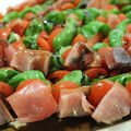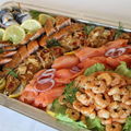 Geburtstagbuffet mit Rinderzunge, Fischvariation, Schweinemedaillon, Butterspargel, Rahmchampignons, Kroketten, Nudelauflauf, gefüllte Eier, Mozzarella-Spieße, Panna Cotta mit Erdbeeren ...
